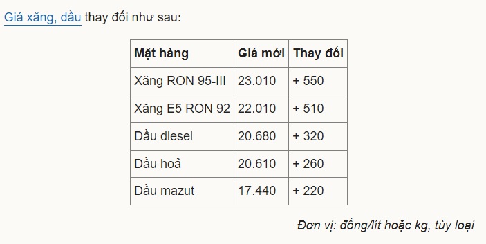 Giá xăng RON 95-III (loại phổ biến trên thị trường) tăng 550 đồng, lên 23.010 đồng một lít. Còn E5 RON 92 ở mức 22.010 đồng một lít, tức thêm 510 đồng.