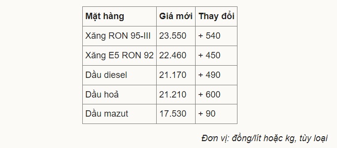 Giá xăng RON 95-III (loại phổ biến trên thị trường) tăng 540 đồng, lên 23.550 đồng một lít. Còn E5 RON 92 ở mức 22.460 đồng một lít, tức thêm 450 đồng.