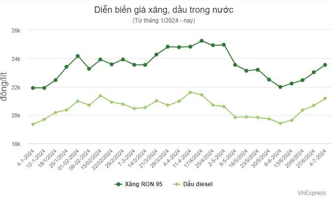 Như vậy, từ đầu năm đến nay, giá xăng có 16 lần tăng, 10 lần giảm. Còn dầu tăng 14 lần, giảm 12 lần. Tính chung một tháng qua, giá xăng RON 95 tăng 1.580 đồng một lít, còn dầu diesel thêm 1.750 đồng một lít.