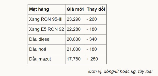 Các mặt hàng dầu có giá mới 17.780-21.030 đồng một lít. So với cách đây 7 ngày, dầu diesel giảm 340 đồng, xuống 20.830 đồng một lít. Dầu hỏa rẻ hơn 180 đồng. Riêng dầu mazut tăng 250 đồng, lên 17.780 một kg.