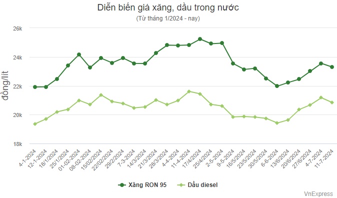 Như vậy, từ đầu năm đến nay, giá xăng có 16 lần tăng, 11 lần giảm. Còn dầu tăng 14 lần, giảm 13 lần. Tính từ đầu năm, giá xăng RON 95 tăng 1.380 đồng một lít, còn dầu diesel thêm 1.470 đồng một lít.