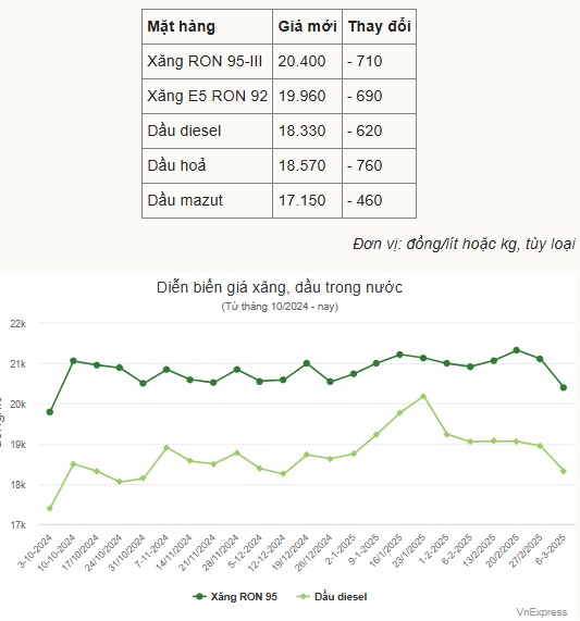 Giá xăng RON 95-III (loại phổ biến trên thị trường) giảm 710 đồng, xuống 20.400 đồng một lít. E5 RON 92 bớt 690 đồng, ở mức 19.960 đồng. Với ngưỡng này, giá nhiên liệu về ngang hồi tháng 12/2024.