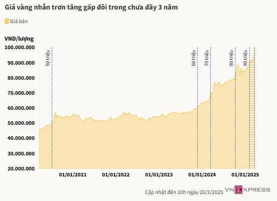 Chưa đầy 1,5 năm kể từ tháng 11/2023, vàng tăng với biên độ nhanh và dồn dập, lần lượt phá các kỷ lục 70, 80, 90 và chính thức chạm mốc 100 triệu đồng mỗi lượng hôm 19/3.