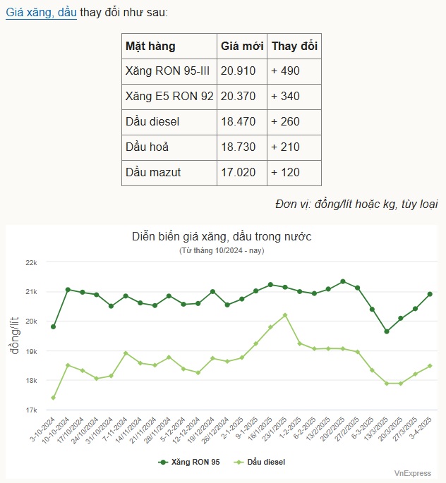 Tương tự, các mặt hàng dầu cũng tăng 120-260 đồng một lít. So với cách đây 7 ngày, dầu diesel lên 18.470 đồng một lít. Dầu hỏa và mazut lần lượt có giá mới 18.730 đồng và 17.020 đồng.