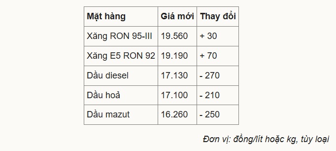 Giá xăng, dầu thay đổi như sau: