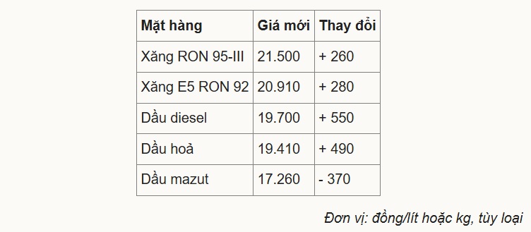 Giá xăng RON 95-III (loại phổ biến trên thị trường) tăng 260 đồng, lên 21.500 đồng một lít. E5 RON 92 cũng thêm 280 đồng, lên 20.910 đồng.
