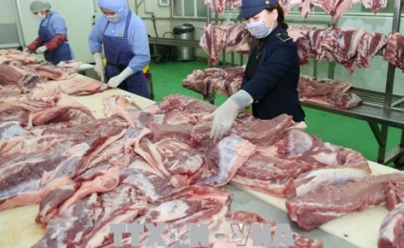 Nhân viên thú y kiểm tra an toàn vệ sinh thực phẩm tại cơ sở chế biến thịt lợn ở khu giết mổ tập trung Vạn Phúc, huyện Thanh Trì (Hà Nội). Ảnh: Vũ Sinh/TTXVN