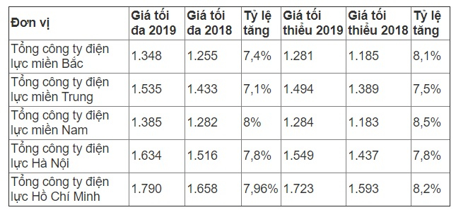 Theo quyết định của Bộ Công Thương, khung giá bán buôn điện của EVN cho các tổng công ty - đơn vị phân phối điện tới người tiêu dùng tăng so với năm 2018. Trong đó, mức giá bán cho Tổng công ty Điện lực miền Trung tăng cao nhất trong 5 đơn vị (tăng 8-8,5% lên 1.385 – 1.284 đồng một kWh). Còn Tổng công ty Điện lực Hồ Chí Minh bị áp giá mua cao nhất với hơn 1.700 đồng mỗi kWh.