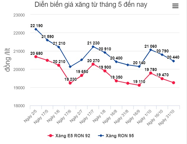 Theo thông tin điều hành của liên Bộ Công Thương - Tài chính, giá xăng dầu bán lẻ trong nước đồng loạt giảm. Mỗi lít xăng E5 RON 92 giảm hơn 200 đồng, xăng RON 95 giảm 550 đồng và các mặt hàng dầu cũng đồng loạt giảm 121-299 đồng. Đây là lần thứ hai liên tiếp từ đầu tháng 10, giá xăng dầu bán lẻ trong nước điều chỉnh giảm.