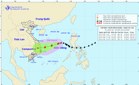 Dự báo trong 24 giờ tới, bão di chuyển theo hướng Tây Tây Nam, mỗi giờ đi được 10km. Đến 04 giờ ngày 04/11, vị trí tâm bão ở khoảng 14,3 độ Vĩ Bắc; 113,2 độ Kinh Đông, cách quần đảo Hoàng Sa khoảng 290km về phía Nam Đông Nam. Sức gió mạnh nhất vùng gần tâm bão mạnh cấp 8-9 (60-90km/giờ), giật cấp 11.