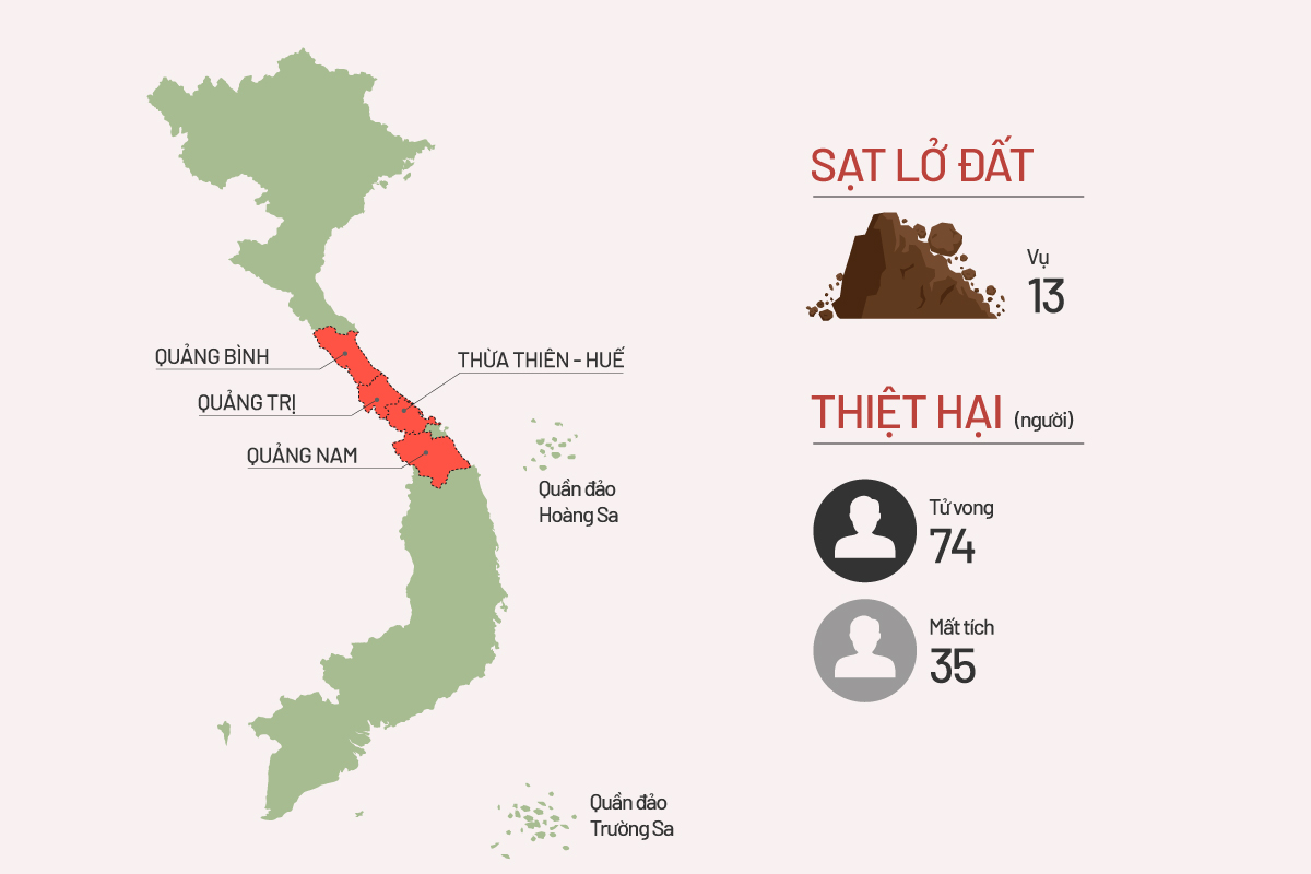 Trong tháng 10, Quảng Bình, Quảng Trị, Thừa Thiên Huế và Quảng Nam xảy ra 13 vụ sạt lở đất khiến 74 người chết và hy sinh, còn 35 người mất tích.