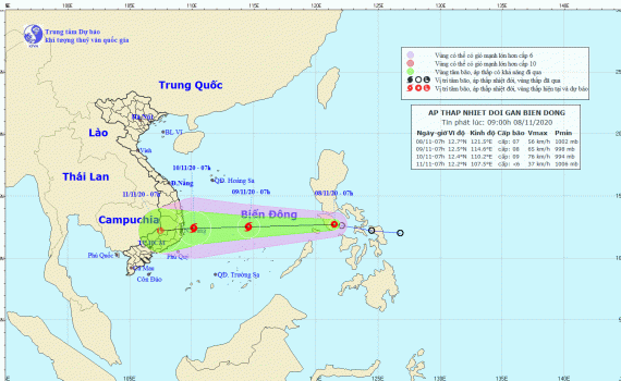 Dự báo trong 24 giờ tới, áp thấp nhiệt đới di chuyển theo hướng Tây, mỗi giờ đi được 25-30km, đi vào Biển Đông và có khả năng mạnh lên thành bão. Đến 07 giờ ngày 09/11, vị trí tâm bão ở khoảng 12,5 độ Vĩ Bắc; 114,6 độ Kinh Đông, cách đảo Song Tử Tây khoảng 220km về phía Đông Đông Bắc. Sức gió mạnh nhất vùng gần tâm bão mạnh cấp 8 (60-75km/giờ), giật cấp 10.