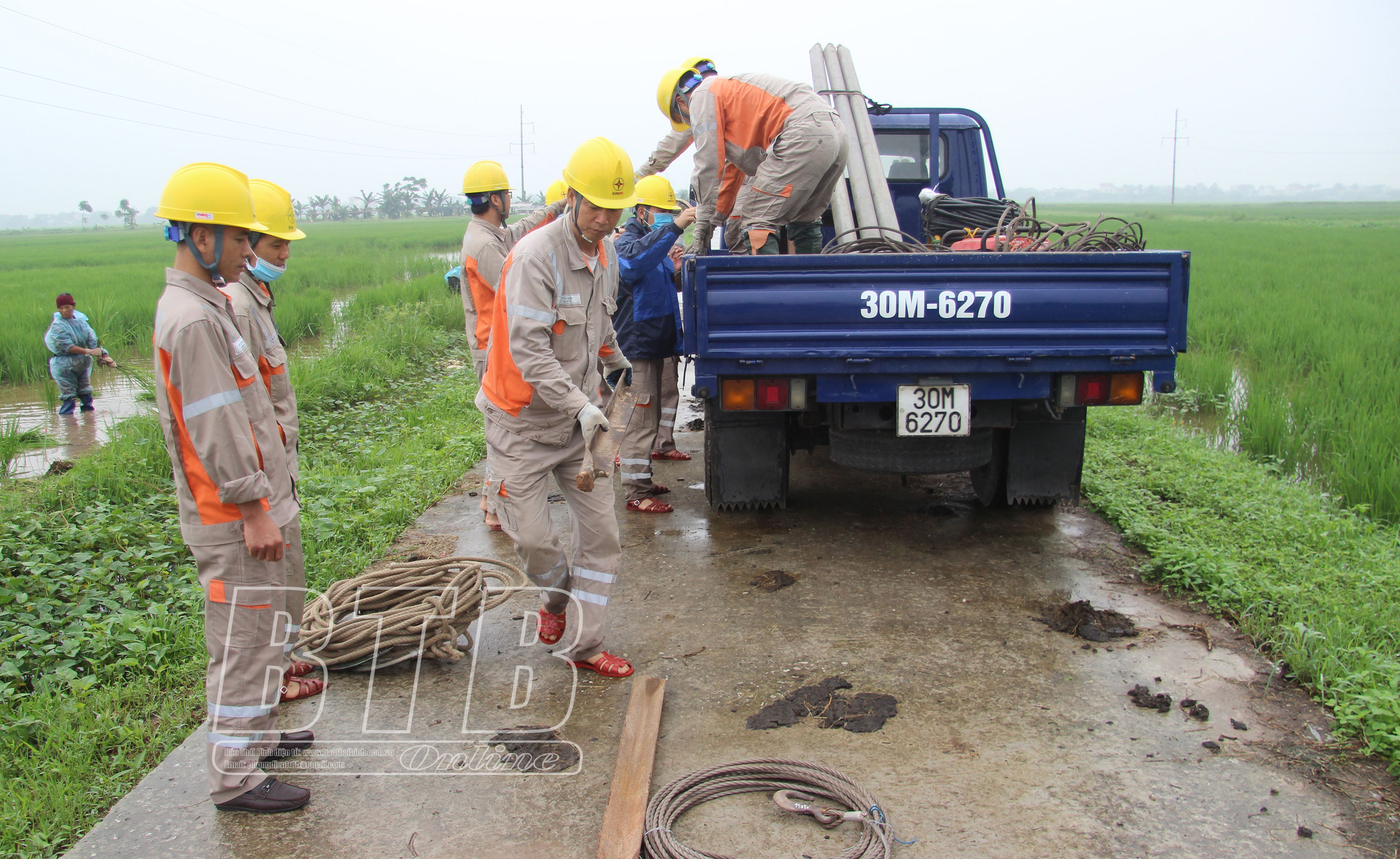 Các công nhân Công ty Điện lực Thái Bình triển khai phương tiện máy móc có mặt kịp thời xử lý tình huống giả định.