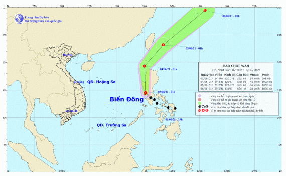 Hồi 01 giờ ngày 03/6, vị trí tâm bão ở vào khoảng 14,5 độ Vĩ Bắc; 120,2 độ Kinh Đông, trên khu vực phía Tây Nam đảo Lu-dông (Phi-líp-pin). Sức gió mạnh nhất vùng gần tâm bão mạnh cấp 8 (60-75km/giờ), giật cấp 10.