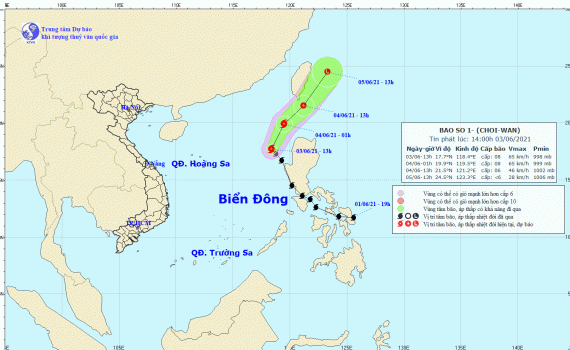 Bão số 1 (Choi-wan) có xu hướng di chuyển lên phía Bắc, sau đó đổi hướng Đông Bắc đi ra ngoài Biển Đông và suy yếu thành áp thấp nhiệt đới. Trong chiều và đêm nay (03/6), ở vùng biển phía Đông khu vực Bắc và giữa Biển Đông (vùng biển giới hạn từ vĩ tuyến 14,0 đến 21,0 độ Vĩ Bắc; kinh tuyến từ 117,0 đến 120,0 độ Kinh Đông) có mưa, gió mạnh cấp 6-7, vùng gần tâm bão đi qua cấp 8, giật cấp 10; biển động mạnh. Cảnh báo cấp độ rủi ro thiên tai ở vùng biển phía Đông khu vực Bắc và giữa Biển Đông: cấp 3.