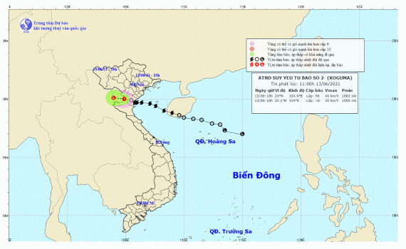 Dự báo trong 06 giờ tới, áp thấp nhiệt đới di chuyển theo hướng Tây Tây Bắc, mỗi giờ đi được 15-20km và suy yếu dần thành một vùng áp thấp. Đến 16 giờ ngày 13/6, vị trí trung tâm vùng áp thấp ở vào khoảng 20,1 độ Vĩ Bắc; 104,0 độ Kinh Đông, trên khu vực Thượng Lào. Sức gió mạnh nhất ở trung tâm vùng áp thấp giảm xuống dưới cấp 6 (dưới 40km/giờ).