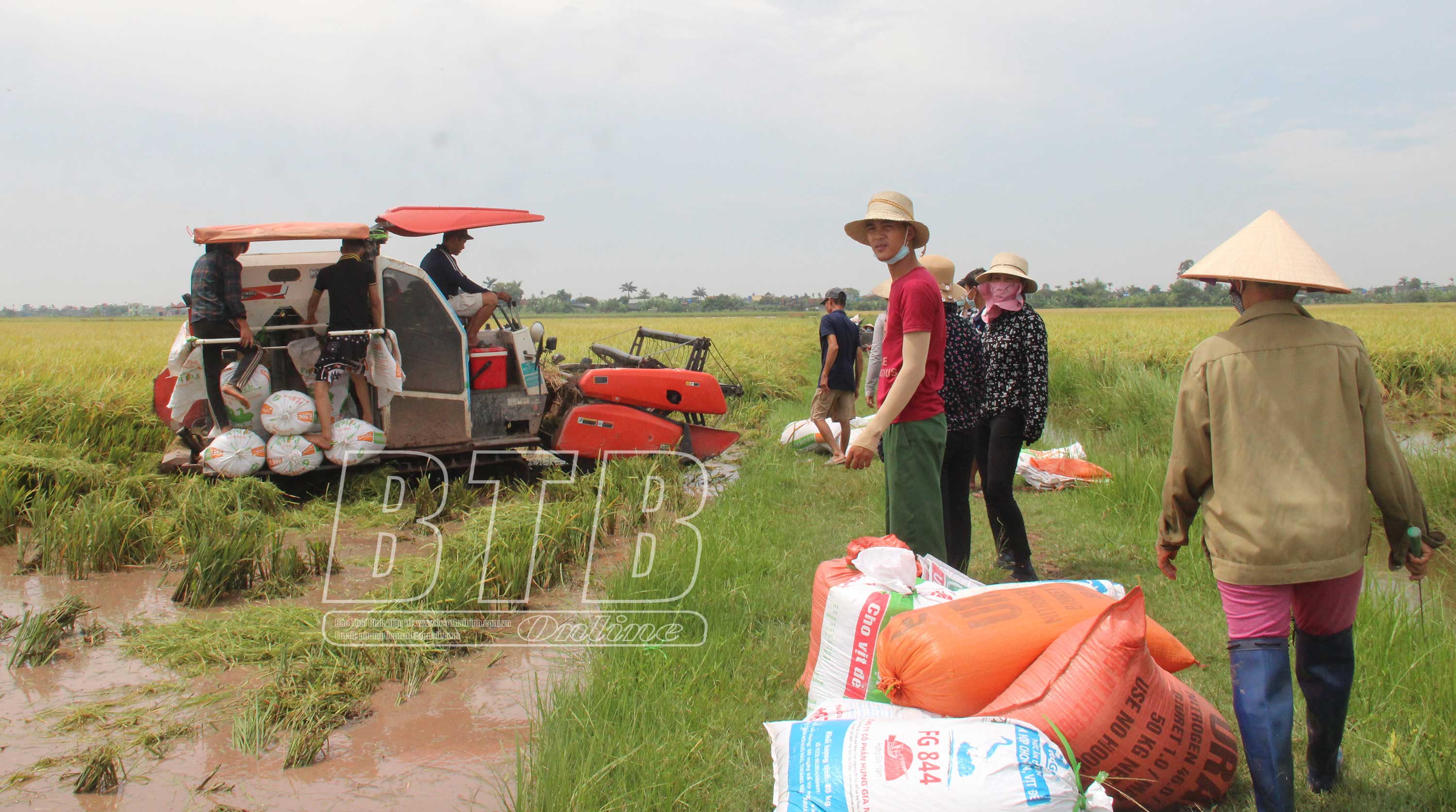 Nông dân huyện Tiền Hải thu hoạch lúa trước khi bão số 2 đổ bộ.