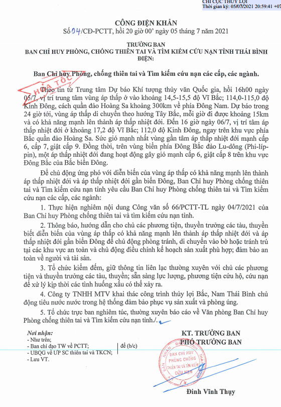 - Công điện khẩn số 03/CĐ-PCTT, hồi 7 giờ 00' ngày 20/7/2024 của Ban Chỉ huy Phòng, chống thiên tai và Tìm kiếm cứu nạn tỉnh Thái Bình 21.07.2024 | 07:47 AM