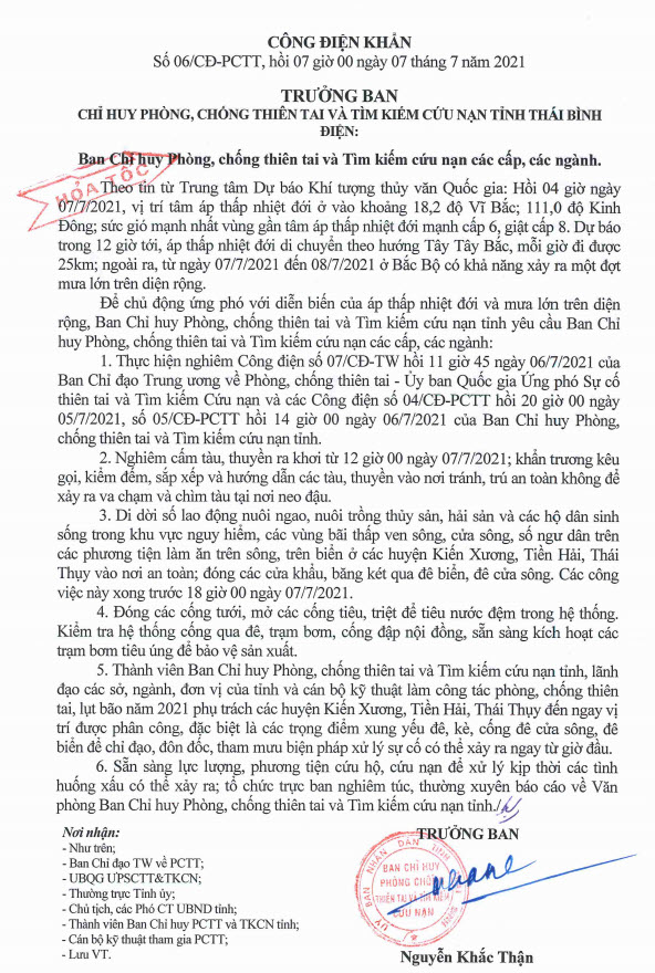 Công điện khẩn số 06 của Trưởng ban Chỉ huy Phòng, chống thiên tai và Tìm kiếm cứu nạn tỉnh Thái Bình