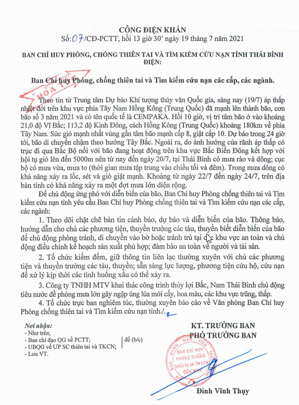 Ngày 19/7/2021, Ban Chỉ huy Phòng, chống thiên tai và Tìm kiếm cứu nạn tỉnh Thái Bình có Công điện khẩn số 07/CĐ-PCTT gửi Ban Chỉ huy Phòng, chống thiên tai và Tìm kiếm cứu nạn các cấp, các ngành.