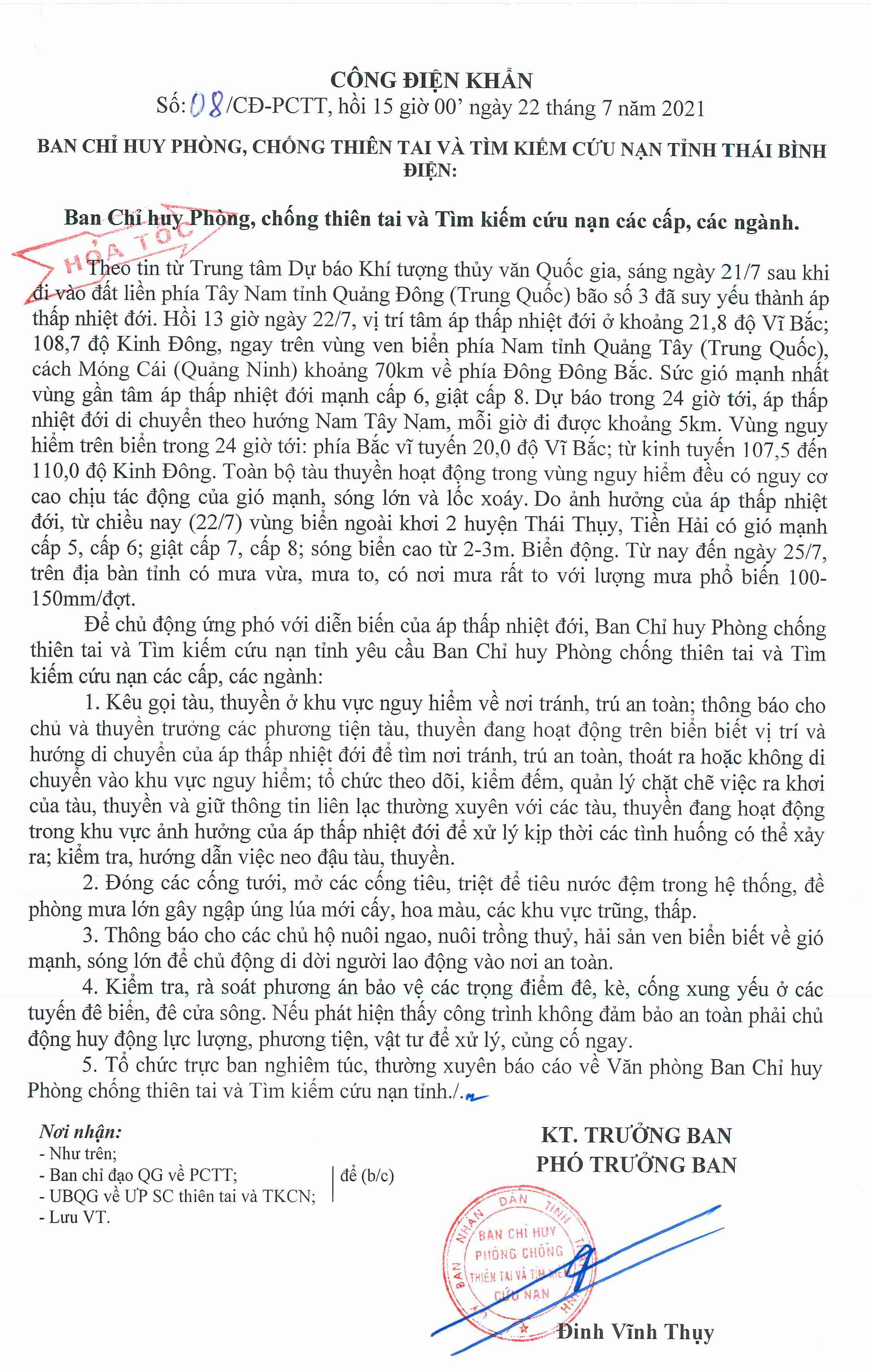 Ngày 22/7/2021, Ban Chỉ huy Phòng, chống thiên tai và Tìm kiếm cứu nạn tỉnh Thái Bình có Công điện khẩn số 08/CĐ-PCTT gửi Ban Chỉ huy Phòng, chống thiên tai và Tìm kiếm cứu nạn các cấp, các ngành.