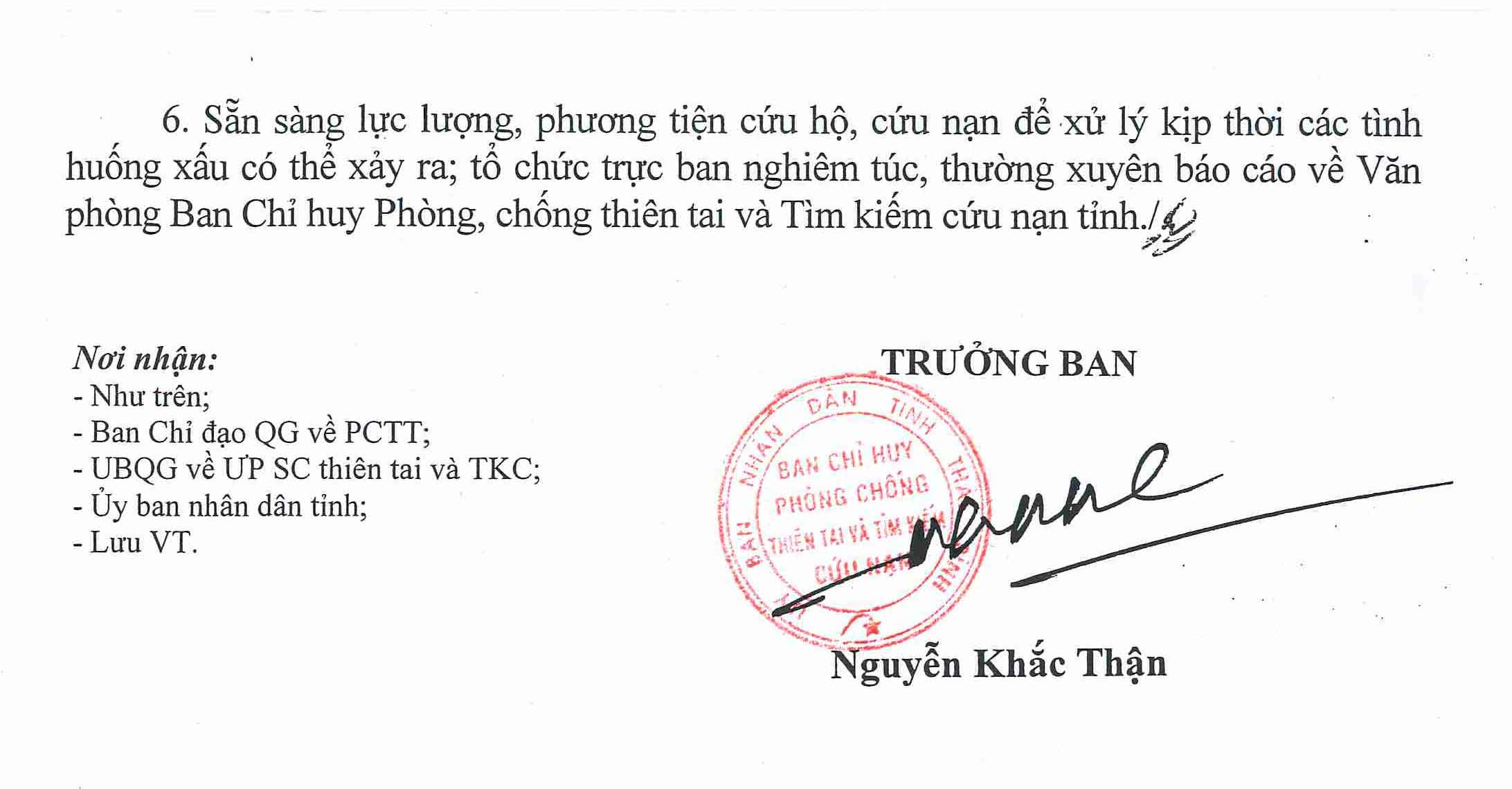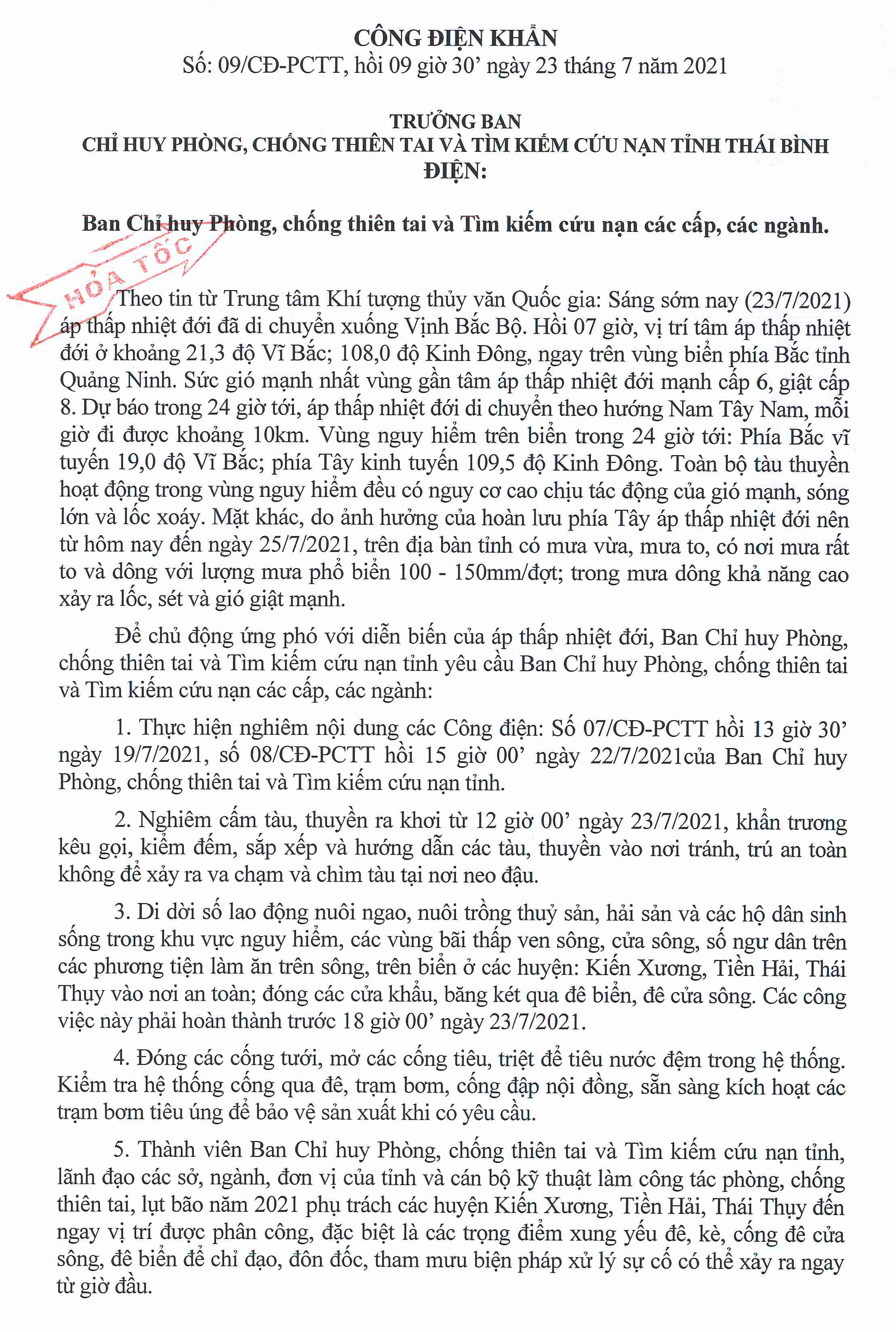 Công điện số 09 của Trưởng ban Chỉ huy Phòng, chống thiên tai và Tìm kiếm cứu nạn tỉnh Thái Bình