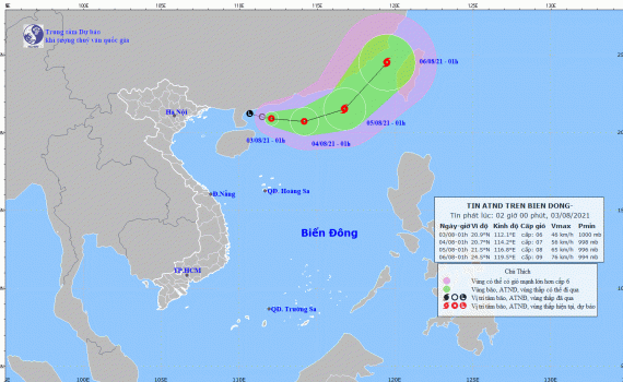 Ngoài ra, do ảnh hưởng của gió mùa Tây Nam, từ hôm nay (03/8) đến ngày 07/8 ở vùng biển từ Bình Định đến Cà Mau, khu vực Bắc và giữa Biển Đông (bao gồm vùng biển quần đảo Hoàng Sa, vùng biển phía Bắc quần đảo Trường Sa) có gió Tây Nam mạnh cấp 6, giật cấp 7-8; sóng biển cao từ 2,0-4,0m, biển động.