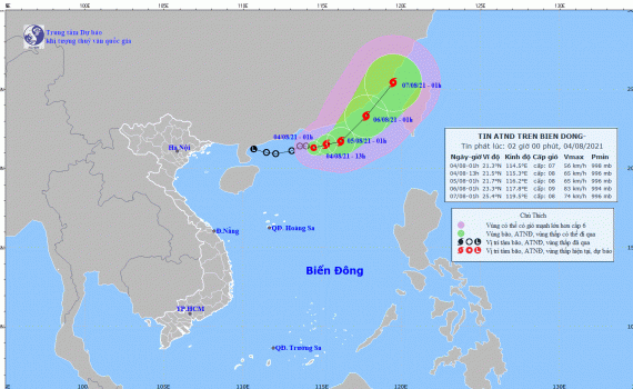 Ngoài ra, do ảnh hưởng của gió mùa Tây Nam hoạt động mạnh, từ nay (04/8) đến ngày 07/8 ở vùng biển từ Bình Định đến Cà Mau, khu vực Biển Đông (bao gồm vùng biển quần đảo Hoàng Sa và Trường Sa) có gió Tây Nam mạnh cấp 6, có lúc cấp 7, giật cấp 8; sóng biển cao từ 2,0-4,0m, biển động mạnh.