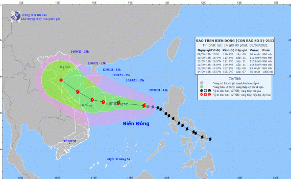 Tin bão trên biển Đông (Cơn bão số 5) hồi 13h ngày 09/09/2021