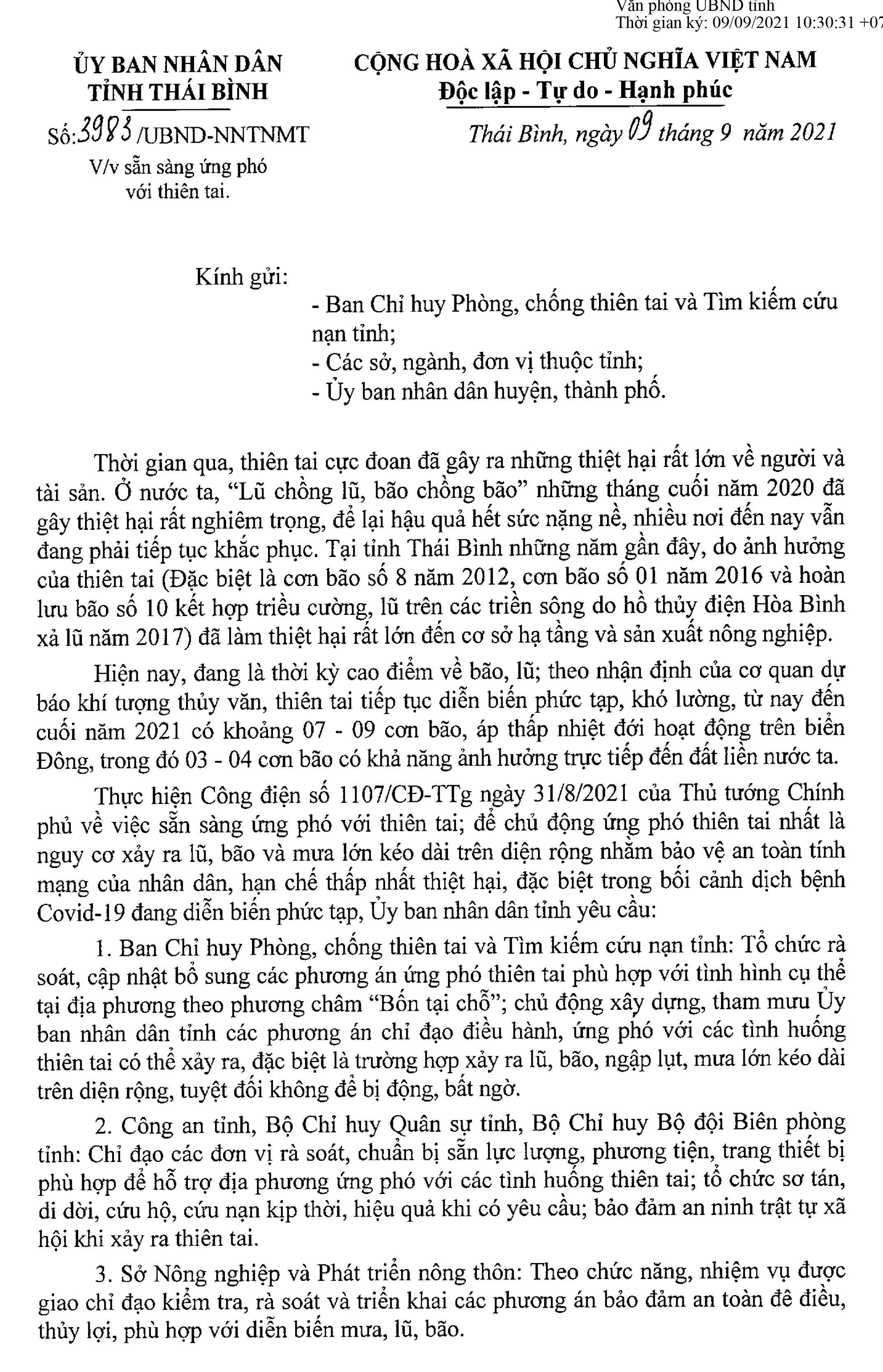 Ngày 9/9/2021, UBND tỉnh Thái Bình ban hành Công văn số 3983/UBND-NNTNMT về việc sẵn sàng ứng phó với thiên tai.