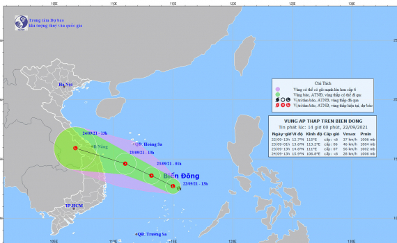 Dự báo trong 12 đến 24 giờ tiếp theo, áp thấp nhiệt đới di chuyển chủ yếu theo hướng Tây Tây Bắc, mỗi giờ đi được 15-20km. Đến 13 giờ ngày 23/9, vị trí tâm áp thấp nhiệt đới ở khoảng 14,6 độ Vĩ Bắc; 111,0 độ Kinh Đông, cách bờ biển Đà Nẵng khoảng 340km, cách bờ biển Bình Định khoảng 240km về phía Đông. Sức gió mạnh nhất vùng gần tâm áp thấp nhiệt đới mạnh cấp 6-7 (40-60km/giờ), giật cấp 9.