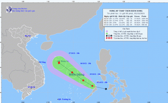 Dự báo trong 12 đến 24 giờ tiếp theo, áp thấp nhiệt đới di chuyển chủ yếu theo hướng Tây Bắc, mỗi giờ đi được 20-25km và có khả năng mạnh thêm. Đến 10 giờ ngày 06/10, vị trí tâm áp thấp nhiệt đới ở khoảng 14,0 độ Vĩ Bắc; 114,8 độ Kinh Đông, cách quần đảo Hoàng Sa khoảng 400km về phía Đông Nam. Sức gió mạnh nhất vùng gần tâm áp thấp nhiệt đới mạnh cấp 7 (50-60km/giờ), giật cấp 9.