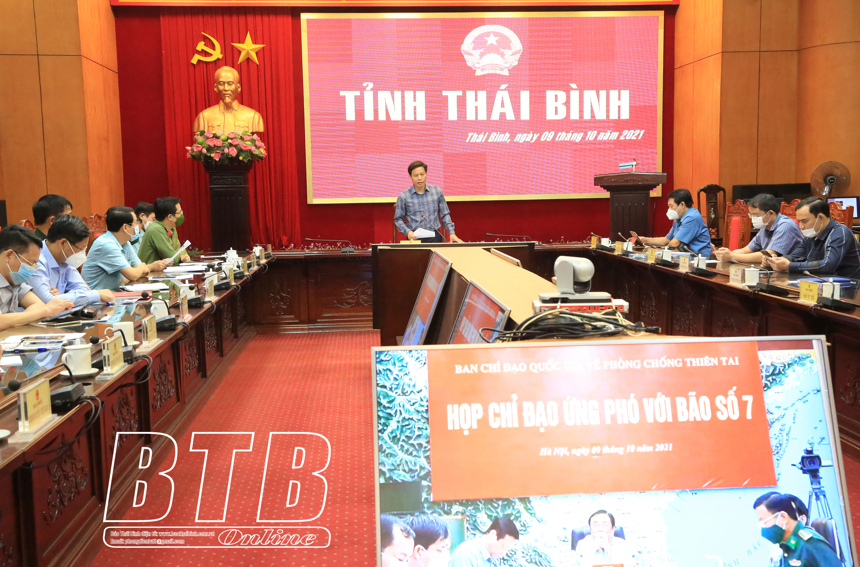 Tại điểm cầu Thái Bình, đồng chí Lại Văn Hoàn, Tỉnh ủy viên, Phó Chủ tịch UBND tỉnh, Phó Trưởng ban thường trực Ban Chỉ huy Phòng, chống thiên tai và Tìm kiếm cứu nạn tỉnh đã báo cáo nhanh tình hình triển khai ứng phó với bão số 7 của tỉnh. Toàn tỉnh có 1.164 tàu, thuyền với 3.423 lao động làm ăn trên biển, đến 15 giờ ngày 9/10 không có phương tiện nào hoạt động trong vùng nguy hiểm; đã di dời 706 lao động canh coi chòi ngao, nuôi trồng thủy sản vào nơi tránh trú an toàn; toàn bộ số hộ lồng bè trên sông đã được thông báo và hướng dẫn chằng chống kịp thời; công tác sơ tán dân trong nhà yếu và khu vực nguy hiểm đang triển khai thực hiện trước khi bão đổ bộ vào. Đến ngày 9/10, toàn tỉnh thu hoạch 37.825ha lúa mùa, đạt 49,3% tổng diện tích; gieo trồng 12.675ha cây vụ đông; công tác tiêu úng đã được các địa phương trong tỉnh chuẩn bị sẵn sàng. Bên cạnh đó, tỉnh đã tổ chức các đoàn đi kiểm tra những công trình thi công dang dở và các trọng điểm xung yếu trên đê cửa sông, đê biển; đồng thời, huy động nhân lực, vật tư, phương tiện theo phương châm “4 tại chỗ”, sẵn sàng xử lý khi có tình huống xảy ra.