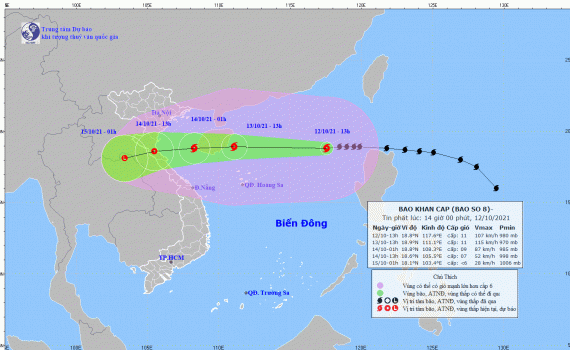 Dự báo trong 24 giờ tới, bão di chuyển nhanh theo hướng Tây, mỗi giờ đi được 25-30km và có khả năng mạnh thêm. Đến 13 giờ ngày 13/10, vị trí tâm bão ở khoảng 18,9 độ Vĩ Bắc; 111,1 độ Kinh Đông, ngay trên vùng biển phía Đông đảo Hải Nam (Trung Quốc). Sức gió mạnh nhất vùng gần tâm bão mạnh cấp 11 (100-120km/giờ), giật cấp 14.