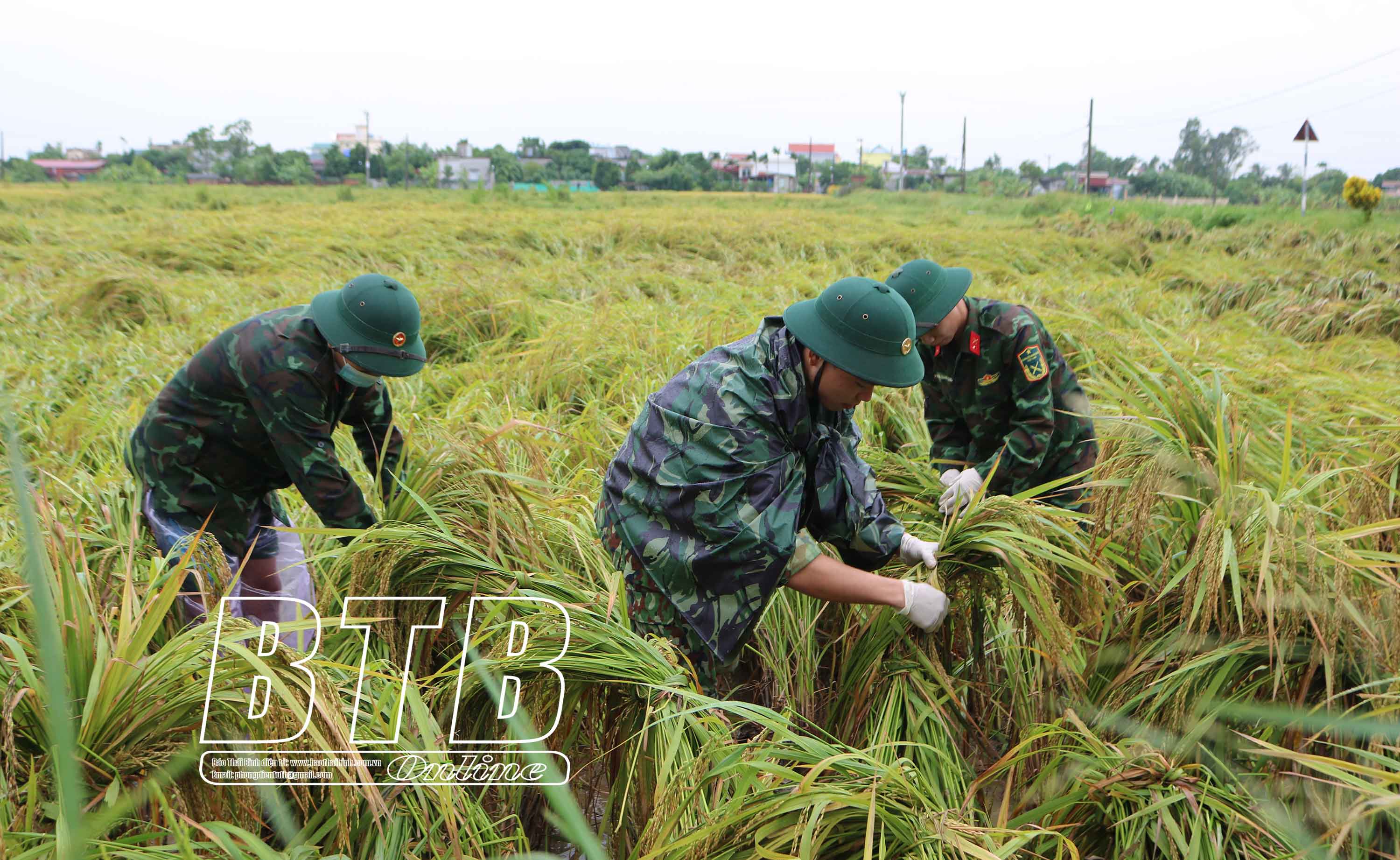Cán bộ, chiến sĩ Bộ CHQS tỉnh giúp nhân dân buộc lúa đổ tại xã Thụy Duyên (Thái Thụy). Ảnh: Trịnh Cường