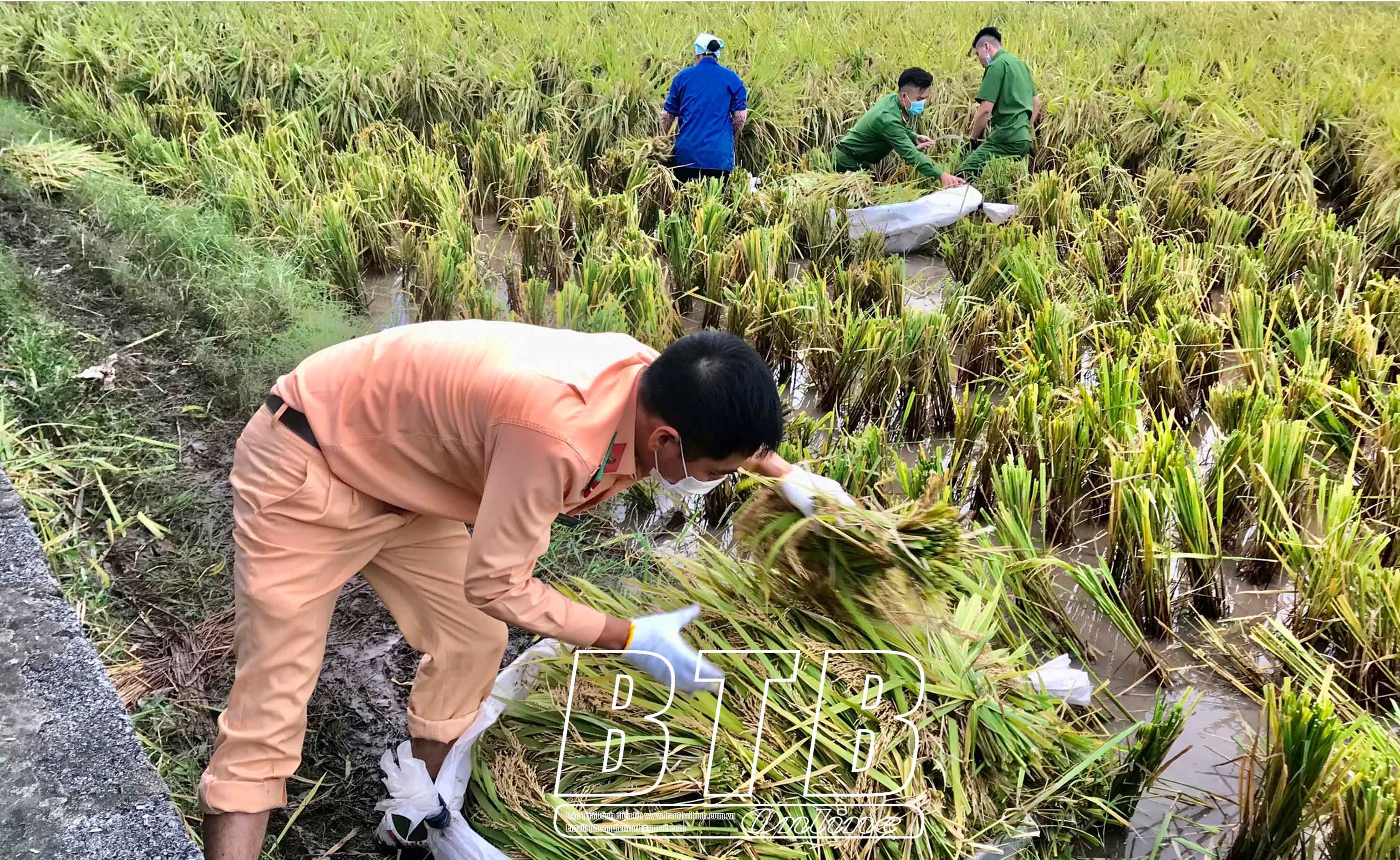 Cán bộ, chiến sĩ Công an tỉnh giúp người dân Thái Thụy thu hoạch lúa trước bão. Ảnh: Tất Đạt