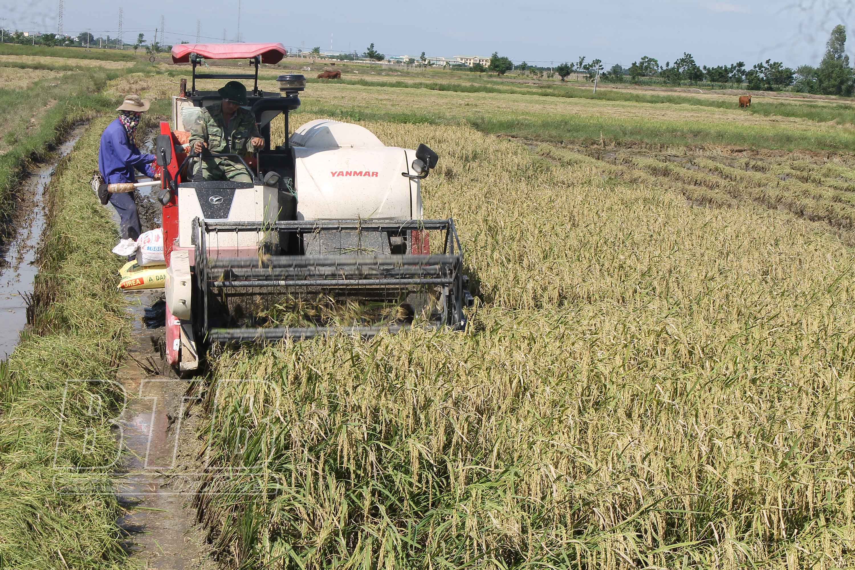 Nông dân Hưng Hà nhanh chóng thu hoạch lúa mùa tránh bão số 8. Ảnh: Thanh Thủy