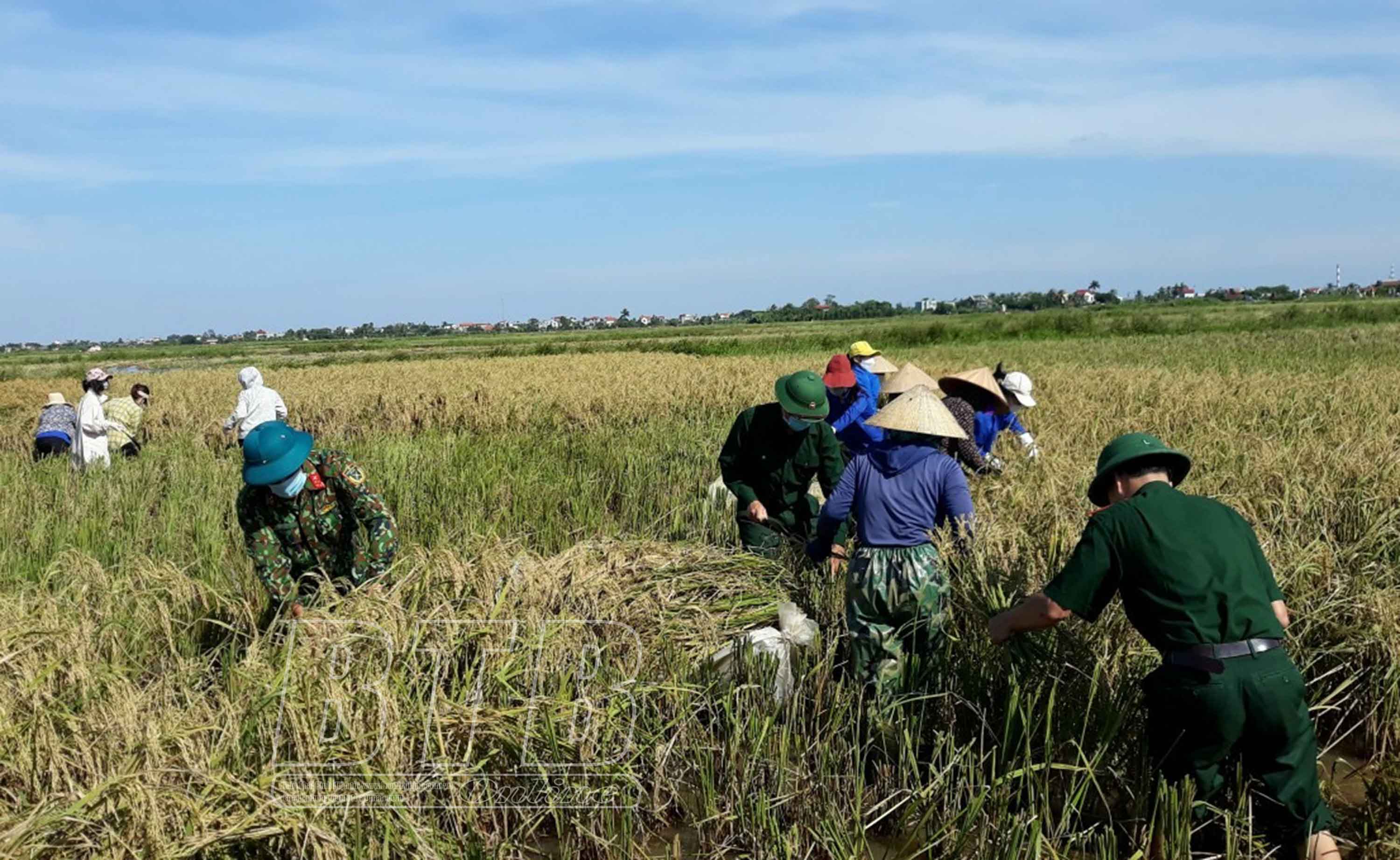 Lực lượng quân sự, đoàn viên thanh niên huyện Thái Thụy thu hoạch lúa giúp nhân dân. Ảnh: Trần Tuấn