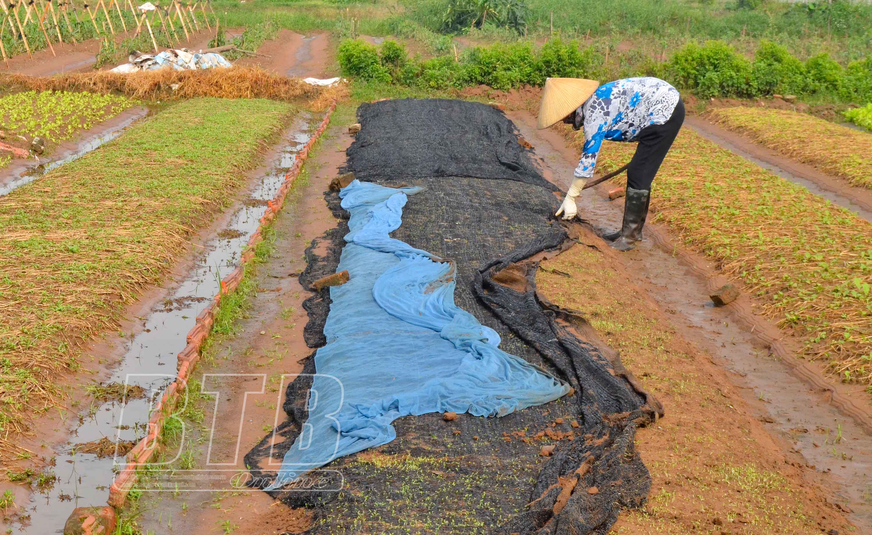 Nông dân xã Vũ Phúc che đậy rau màu phòng, chống mưa bão. Ảnh: Minh Nguyệt