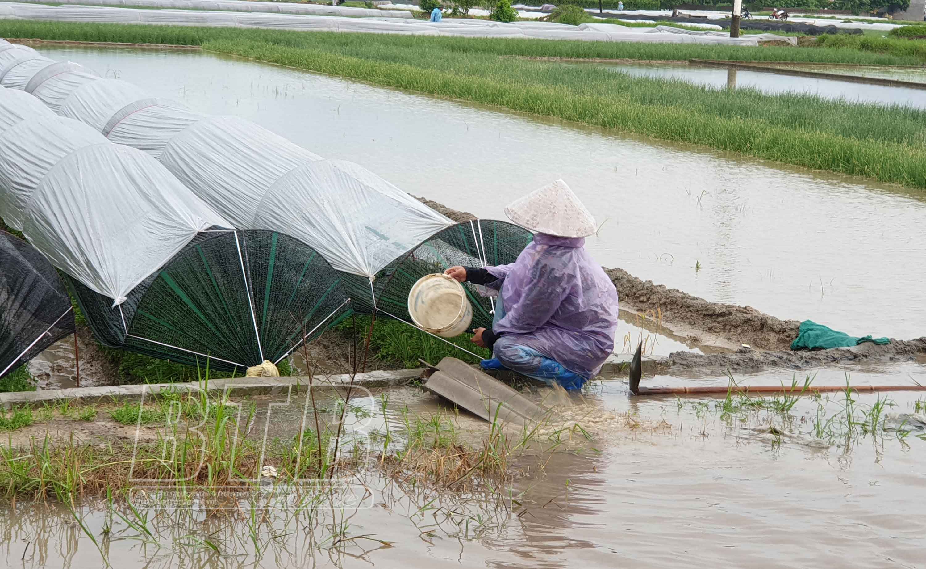 Nông dân xã Quỳnh Hải tổ chức che chắn, tiêu úng cho diện tích rau màu. Ảnh: Nguyễn Cường