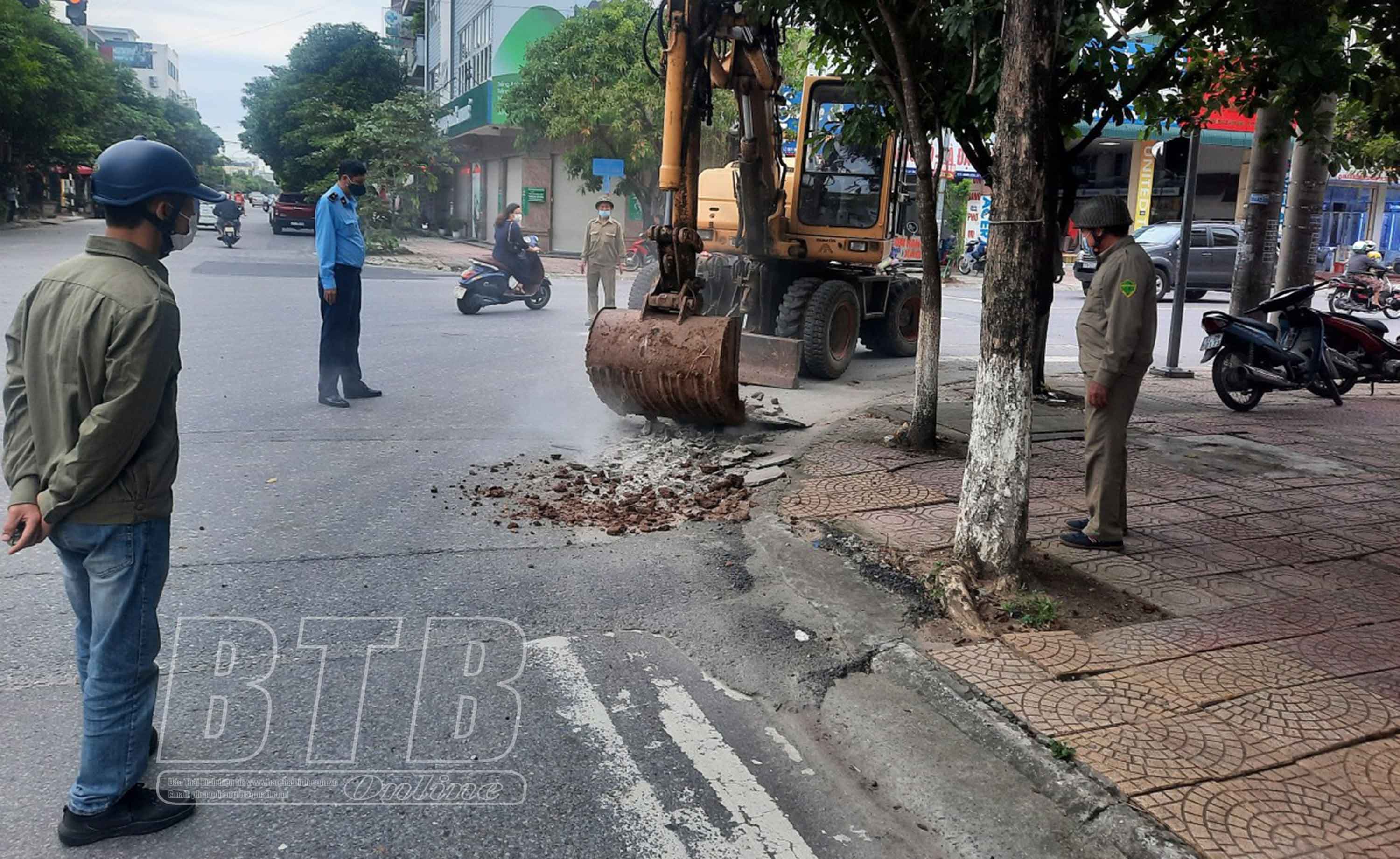 Đội Thanh tra xây dựng và Quản lý trật tự đô thị thành phố phối hợp với phường Trần Lãm xử lý bậc lên xuống vỉa hè. Ảnh: Minh Nguyệt