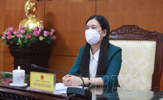 Đồng chí Trần Thị Bích Hằng, Tỉnh ủy viên, Phó Chủ tịch UBND tỉnh, Phó Trưởng ban Chỉ huy Phòng, chống thiên tai và Tìm kiếm cứu nạn tỉnh dự hội nghị tại điểm cầu Thái Bình.