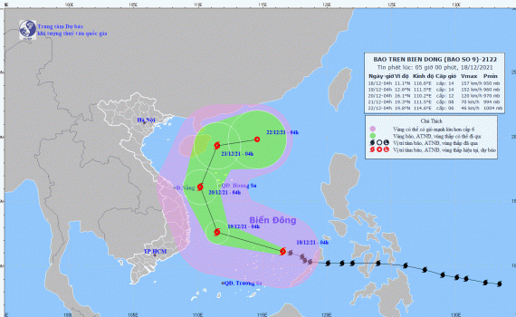 Dự báo trong 24 giờ tới, bão di chuyển nhanh theo hướng Tây Tây Bắc, mỗi giờ đi được 20-25km. Đến 04 giờ ngày 19/12, vị trí tâm bão ở khoảng 12,6 độ Vĩ Bắc; 111,5 độ Kinh Đông, cách Phú Yên – Khánh Hòa khoảng 250km về phía Đông. Sức gió mạnh nhất vùng gần tâm bão mạnh cấp 13-14 (135-165km/giờ), giật cấp 16.