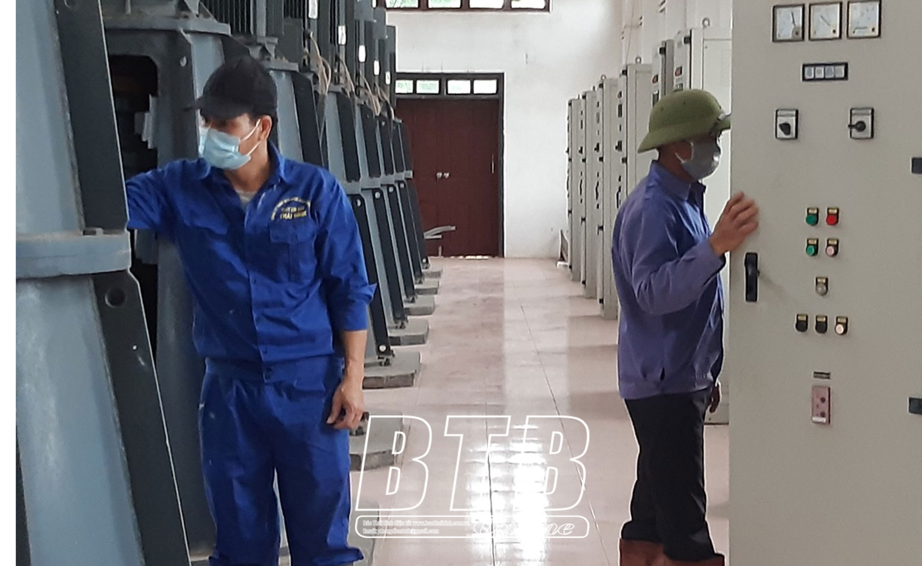 Cán bộ Xí nghiệp Khai thác công trình thủy lợi huyện Hưng Hà kiểm tra hệ thống trạm bơm Tịnh Xuyên sẵn sàng tiêu úng khi có mưa lớn xảy ra.