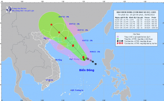 Dự báo trong 24 giờ tới, bão di chuyển chủ yếu theo hướng Tây Bắc, mỗi giờ đi được 10-15km và có khả năng mạnh thêm. Đến 19 giờ ngày 01/7, vị trí tâm bão ở khoảng 19,5 độ Vĩ Bắc; 112,5 độ Kinh Đông, cách quần đảo Hoàng Sa khoảng 370km về phía Bắc Đông Bắc. Sức gió mạnh nhất vùng gần tâm bão mạnh cấp 10 (89-102km/giờ), giật cấp 12.