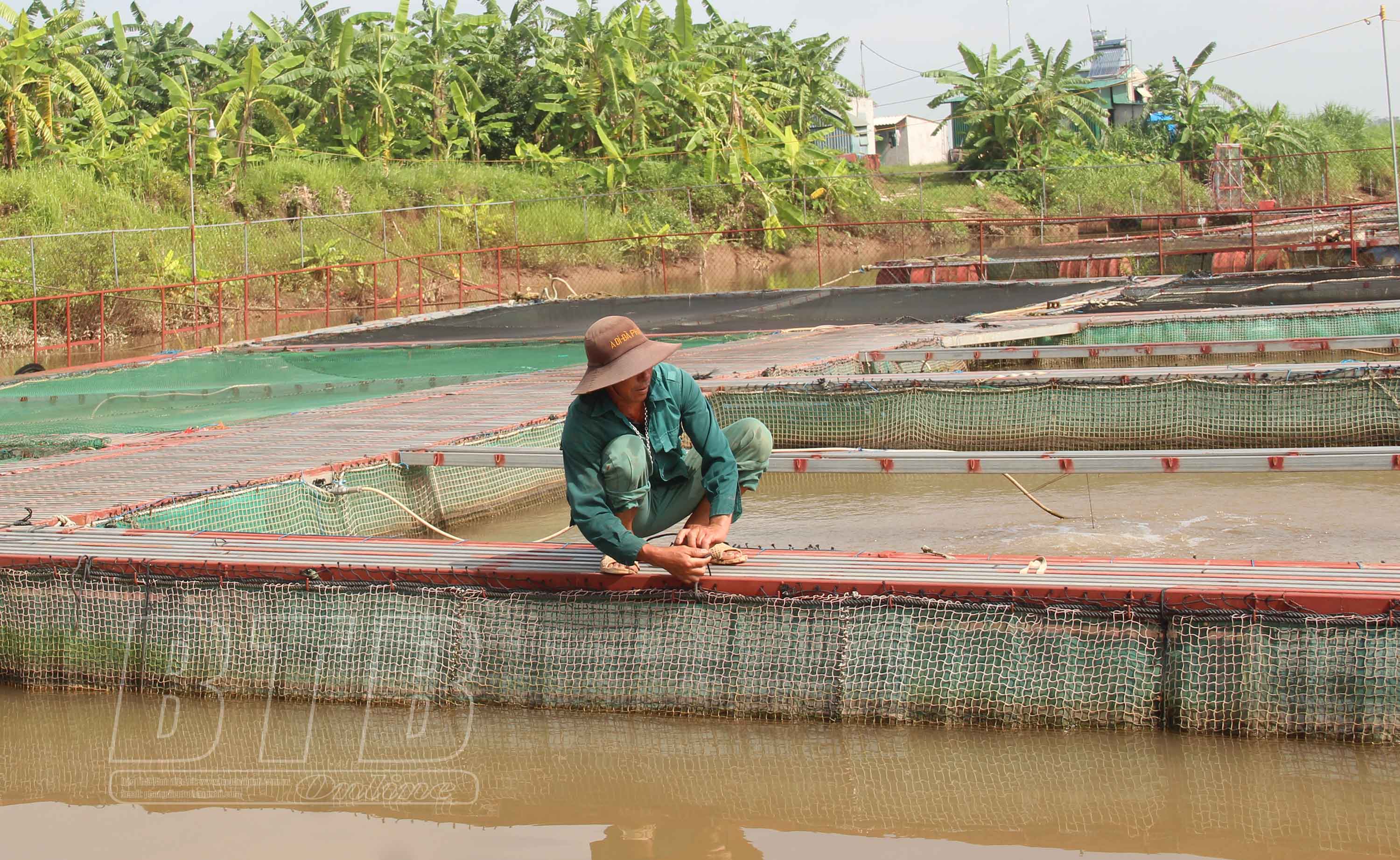 Người nuôi cá lồng xã Quỳnh Hoa (Quỳnh Phụ) gia cố lại lồng bè, tránh thiệt hại do thiên tai bất thuận.