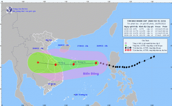 Dự báo trong 24 giờ tới, bão di chuyển chủ yếu theo hướng Tây, mỗi giờ đi được 20-25km có xu hướng mạnh thêm. Đến 13 giờ ngày 27/9, vị trí tâm bão ở khoảng 15,7 độ Vĩ Bắc; 111,8 độ Kinh Đông, ngay trên khu vực phía Nam quần đảo Hoàng Sa. Sức gió mạnh nhất vùng gần tâm bão mạnh cấp 13-14 (134-166km/giờ), giật cấp 17.