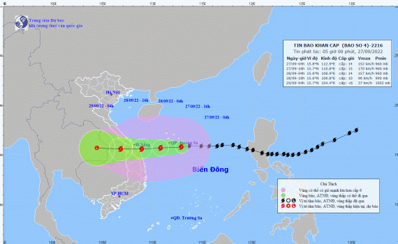 Hồi 04 giờ ngày 27/9, vị trí tâm bão ở khoảng 15,8 độ Vĩ Bắc; 112,9 độ Kinh Đông, trên vùng biển phía Đông Nam quần đảo Hoàng Sa. Sức gió mạnh nhất vùng gần tâm bão mạnh cấp 14 (150-166km/giờ), giật cấp 16. Bán kính gió mạnh từ cấp 6, giật từ cấp 8 trở lên khoảng 250km tính từ tâm bão; bán kính gió mạnh từ cấp 10, giật từ cấp 12 trở lên khoảng 150km tính từ tâm bão.
