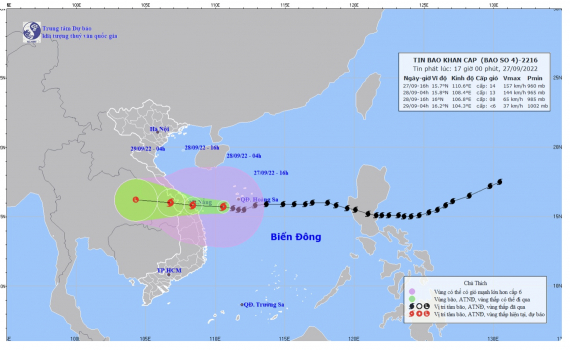 Hồi 16 giờ ngày 27/9, vị trí tâm bão ở khoảng 15,7 độ Vĩ Bắc; 110,6 độ Kinh Đông, cách đất liền khu vực Đà Nẵng-Quảng Ngãi khoảng 210km về phía Đông. Sức gió mạnh nhất vùng gần tâm bão mạnh cấp 14 (150-166km/giờ), giật cấp 17. Bán kính gió mạnh từ cấp 6, giật từ cấp 8 trở lên khoảng 300km tính từ tâm bão; bán kính gió mạnh từ cấp 10, giật từ cấp 12 trở lên khoảng 150km tính từ tâm bão.