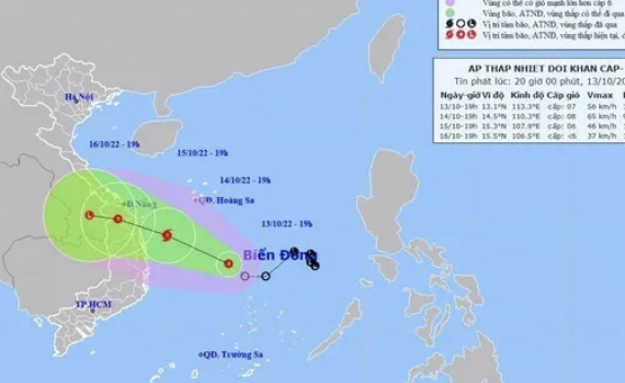 Hồi 19 giờ ngày 13/10, vị trí tâm áp thấp nhiệt đới ở vào khoảng 13,1 độ vĩ bắc; 113,3 độ kinh đông, trên khu vực giữa Biển Đông, cách đảo Song Tử Tây khoảng 210km về phía Bắc Tây Bắc, cách đất liền các tỉnh Quảng Ngãi-Bình Định khoảng 410km về phía đông.